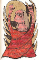 Flow 13: Although this character was supposed to be a creature, it has a human look, as big-eyed creatures often do, and the eye and nose area forms the familiar triangle of human symmetry. The mask-like patterning pleases me, as well as the reds and blacks, creative flash. As I continue working on the printed (novel) pages, I find the already-filled-with-print work area more and more liberating. Like drawing on newspaper or in a ruled notebook, the exercise is most casual and careless--and therefore intensely creative--because right from the beginning there is no master plan or lofty purpose for the drawing. It is simply creative play, partly destructive--because an entire novel is being defaced--but mostly inventive, because there is nothing to be lost in aimless doodling and scribbling.